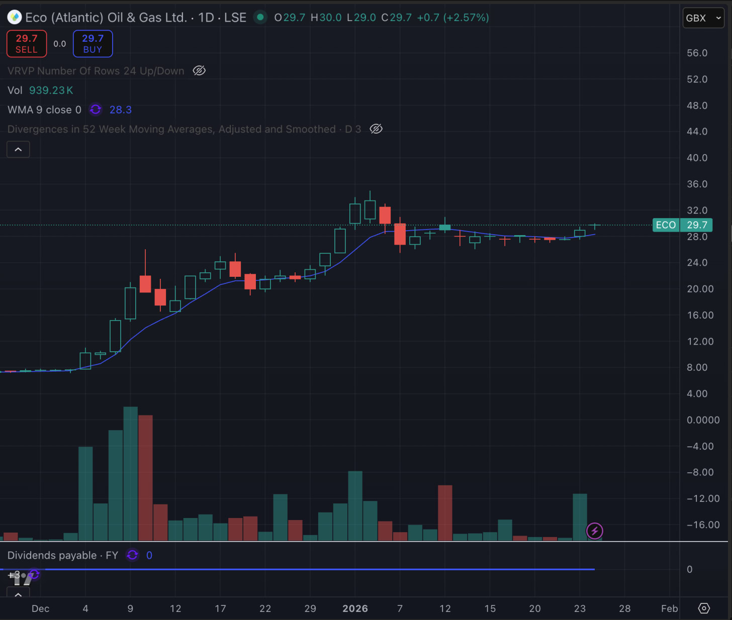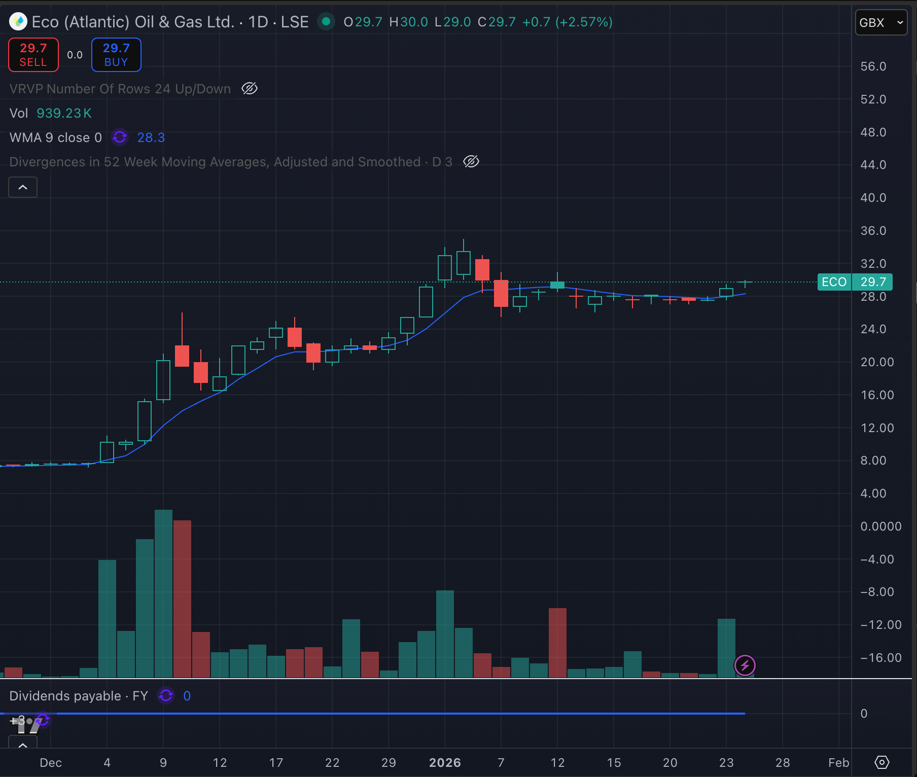 Eco Atlantic closed the trading day of Friday, the 23 of January, at 29p in a high volume of 8 million shares.